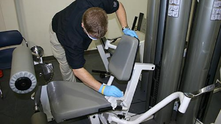 نظافت محیط باشگاه ورزشی به همراه تمامی وسایل و تجهیزات مورد استفاده ورزشکاران باید روزانه و به طور منظم تمیز و نظافت گردند. علاوه بر نظافت های روتین روزانه توسط مواد شوینده صنعتی مناسب، ضدعفونی کردن دستگاه های ورزشی ضروری است، به این معنی که تنها مصرف مواد شوینده برای تمیز نمودن سالن های ورزشی کافی نبوده و باید مواد مخصوص ضدعفونی کننده به کار گرفته شود.